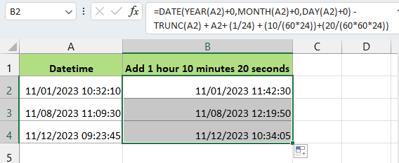 Ví dụ: Để thêm 1 giờ, 10 phút và 20 giây vào ngày giờ trong ô A2, hãy sử dụng công thức: