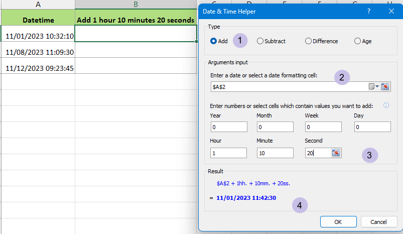 Kutools cho Excel ‘s Người trợ giúp ngày giờ là công cụ thay đổi cuộc chơi để quản lý ngày và giờ trong bảng tính của bạn. Công cụ này đơn giản hóa các tác vụ phức tạp như cộng hoặc trừ thời gian, tính tuổi và quản lý các khoảng thời gian, tất cả đều không cần các công thức phức tạp. Giao diện trực quan của nó tích hợp mượt mà với Excel, khiến nó trở nên hoàn hảo cho cả người mới bắt đầu và người dùng thành thạo..