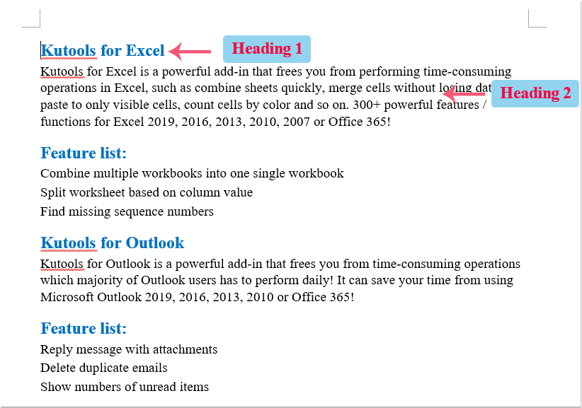 1. Mở tài liệu Word của bạn, định dạng văn bản sẽ được nhập vào PowerPoint dưới dạng tiêu đề Heading 1 và sau đó, định dạng nội dung khác thành kiểu Heading 2 sẽ là nội dung trang chiếu, xem ảnh chụp màn hình: