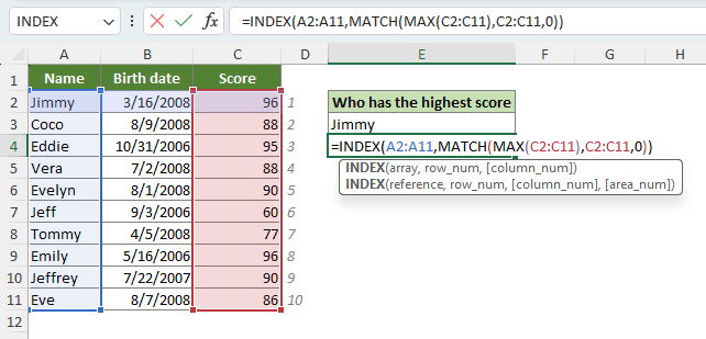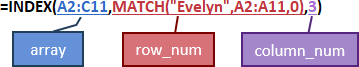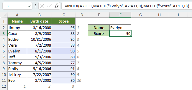 =INDEX(A2:C11,MATCH(“Evelyn”,A2:A11,0),MATCH(“Score”,A1:C1,0))