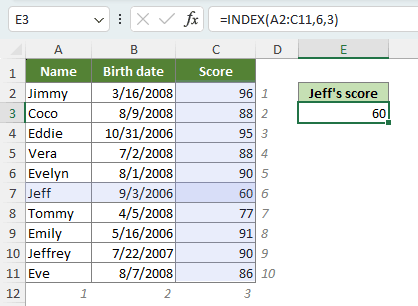 Bây giờ chúng ta nên biết rằng hàm INDEX có thể hoạt động hoàn hảo với phạm vi ngang hoặc dọc. Nhưng điều gì sẽ xảy ra nếu chúng ta cần nó để trả về một giá trị trong một phạm vi lớn hơn với nhiều hàng và cột? Trong trường hợp này, chúng ta nên áp dụng cả số hàng và số cột. Ví dụ, để tìm hiểu điểm số của Jeff trong phạm vi bảng thay vì một cột duy nhất, chúng ta có thể xác định điểm của anh ấy bằng một số hàng 6 và cột số 3 trong các tế bào từ A2 đến C11 như thế này: