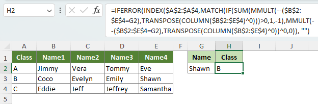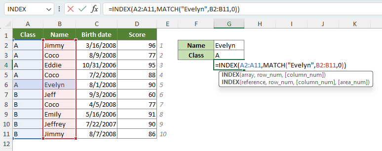 Để tìm Lớp của Evelyn, áp dụng công thức sau để tìm kiếm Evelyn ở B2:B11 và lấy giá trị tương ứng từ A2:A11.