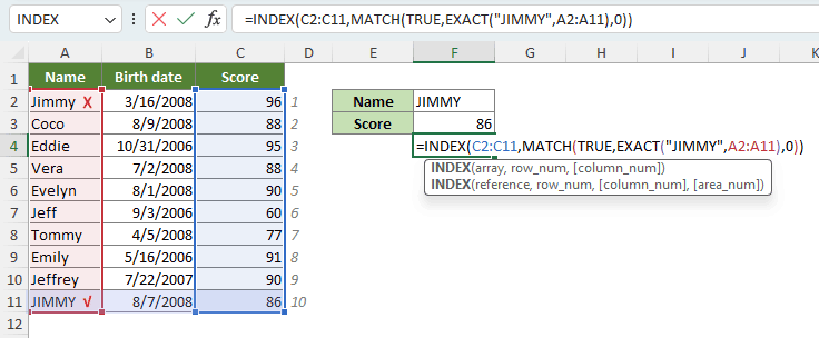 =INDEX(C2:C11,MATCH(TRUE,EXACT(“JIMMY”,A2:A11),0))
