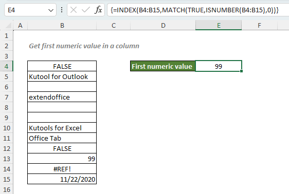 Để truy xuất giá trị số đầu tiên từ một cột hoặc một hàng, hãy sử dụng công thức dựa trên các hàm INDEX, MATCH và ISNUMBER.