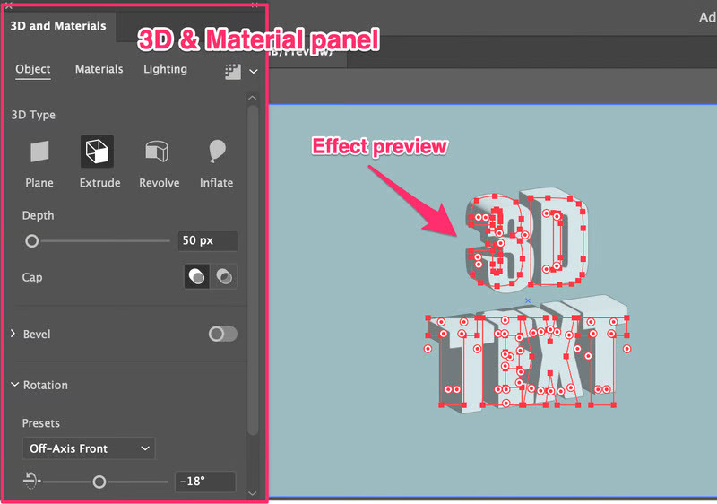 Khi bạn chọn một hiệu ứng, bảng 3D và Material sẽ bật lên và đó là nơi bạn sẽ làm việc với hiệu ứng văn bản 3D của mình. Bạn cũng sẽ nhận thấy văn bản của mình thay đổi khi bạn điều chỉnh cài đặt.