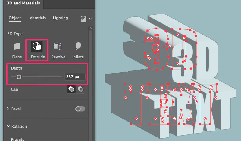 Bước 4: Điều chỉnh cài đặt trên bảng 3D và vật liệu. Bạn có thể làm rất nhiều việc để tạo các hiệu ứng 3D khác nhau. Trước hết, hãy chọn loại 3D. Ví dụ: nếu bạn chọn Extrude, bạn có thể bắt đầu bằng cách điều chỉnh độ sâu.