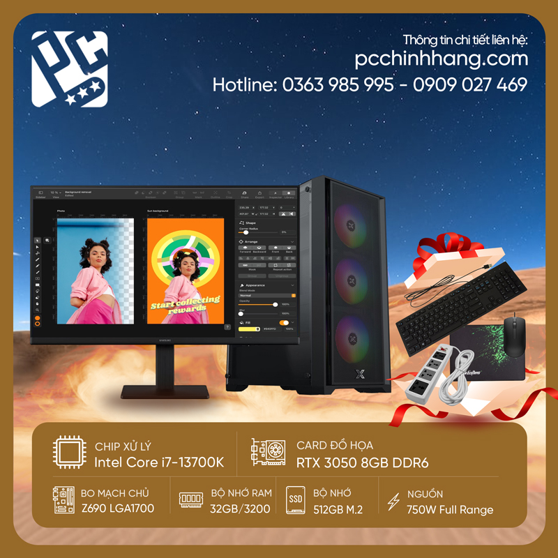 Trong dải ngân hà công nghệ đầy sao, PC Design i7 Gen 13 PCDI713K tỏa sáng như một siêu sao – hội tụ sức mạnh vô tận từ CPU i7-13700K thống trị đa nhiệm, RAM 32GB cuồn cuộn năng lượng, SSD Samsung 512GB chớp nhoáng, RTX 3050 8GB phép màu đồ họa, được nâng tầm bởi main Z690 tinh xảo, màn hình 27 inch 100Hz mê hoặc, nguồn Jetek 750W bất khuất, case Gamdias Aura GC2 lung linh với fan ARGB, tản nhiệt nước 240mm êm ái – kèm quà tặng Logitech tiện nghi và bảo hành 24 tháng. Điểm mạnh cốt lõi: hiệu suất lốc xoáy cho mọi thử thách, thiết kế vũ trụ thẩm mỹ, và khả năng nâng cấp mở rộng vô biên – tất cả tạo nên một kiệt tác không chỉ mạnh mẽ mà còn truyền lửa đam mê.